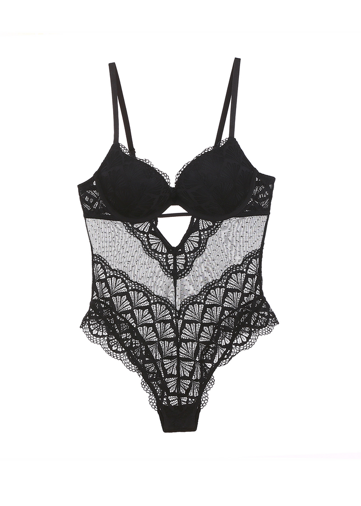 OLIVIA Sexy Push-Up Mesh Black Lace Bodysuit