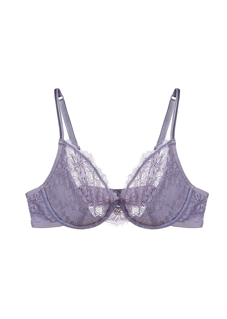Our unlined, sheer, lace bra has delicate eyelash lace details in a single layer over supportive, halfmoon padded cups. The muted lavender color brings a soft romance to this bra, making it perfect for when you want to feel that subtle sexiness for a special occasion or just for you. A single silver pendant brings some sparkle to the plunging neckline, and the two elastic straps bring all-day support. Plus, our sustainable fabrics mean this underwired bra is the peak of comfort and eco-conscious fashion, so you can feel good about what you’re wearing.